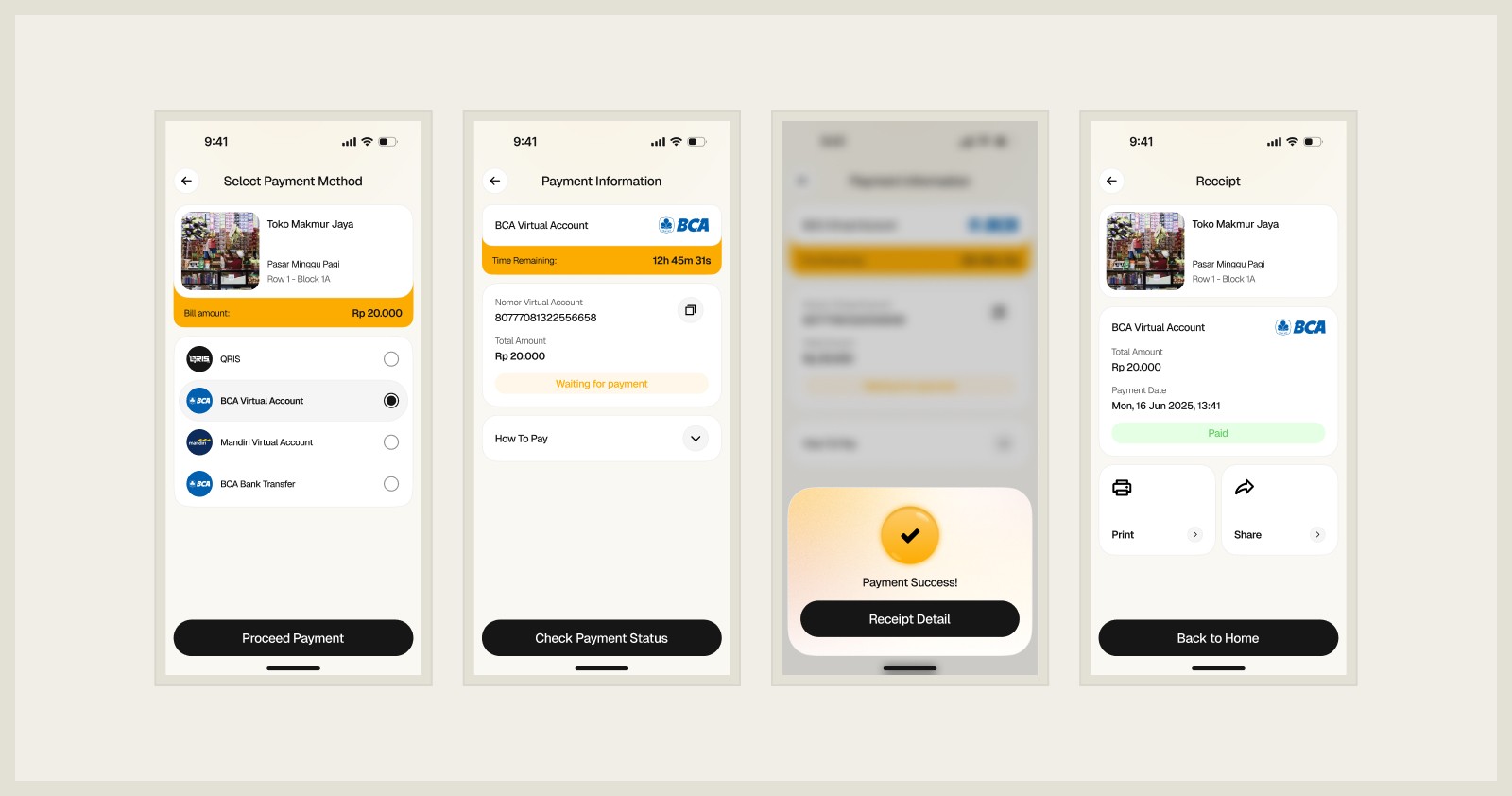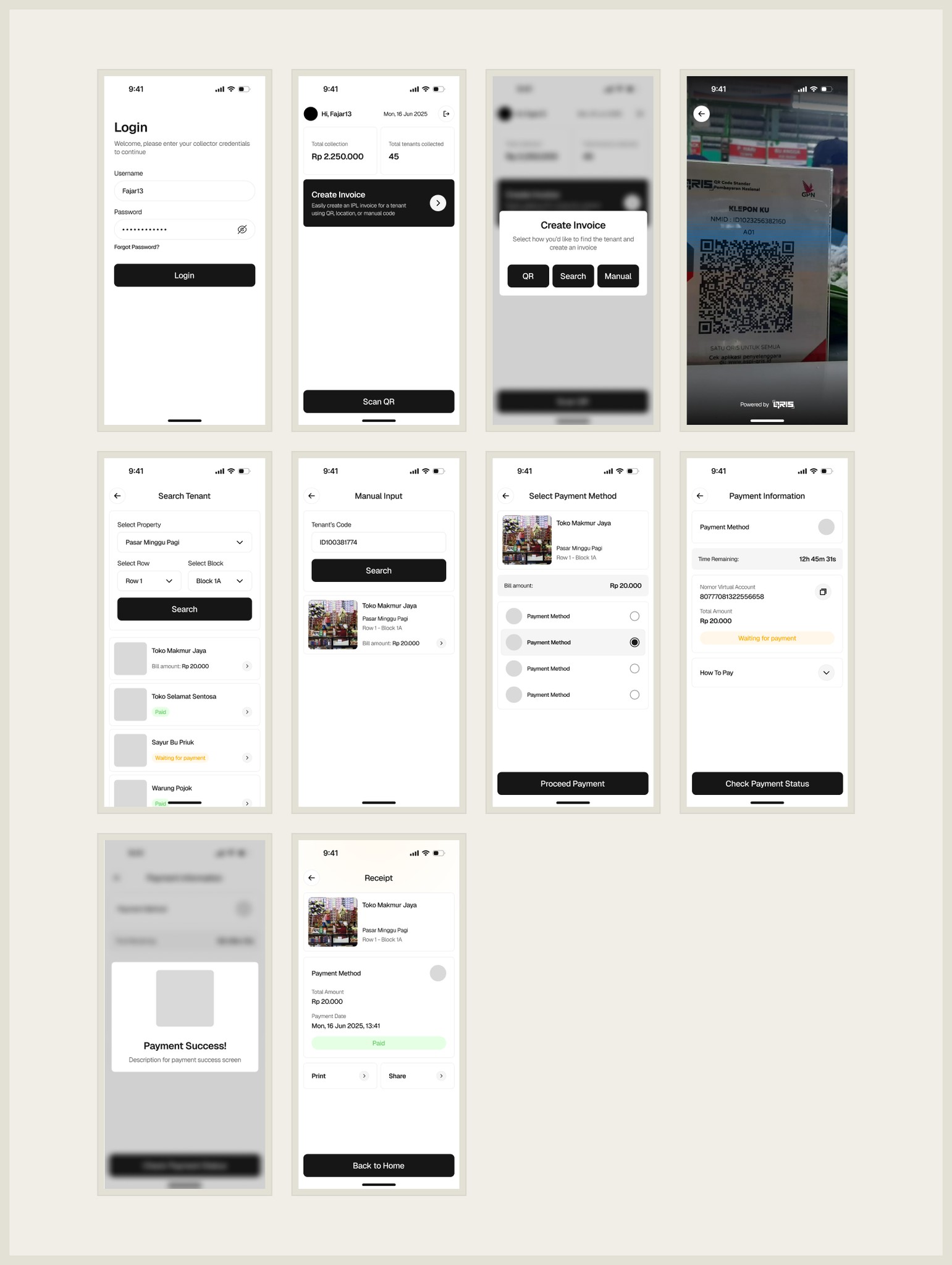 After setting the flow, I focused on design. Collectors often work outside, on foot, or in areas with limited signal, so the interface had to be fast and simple. I used large buttons, clean layouts, and easy-to-read text. The payment screen was also designed to feel safe and clear for tenants, even for those who are not used to using apps.